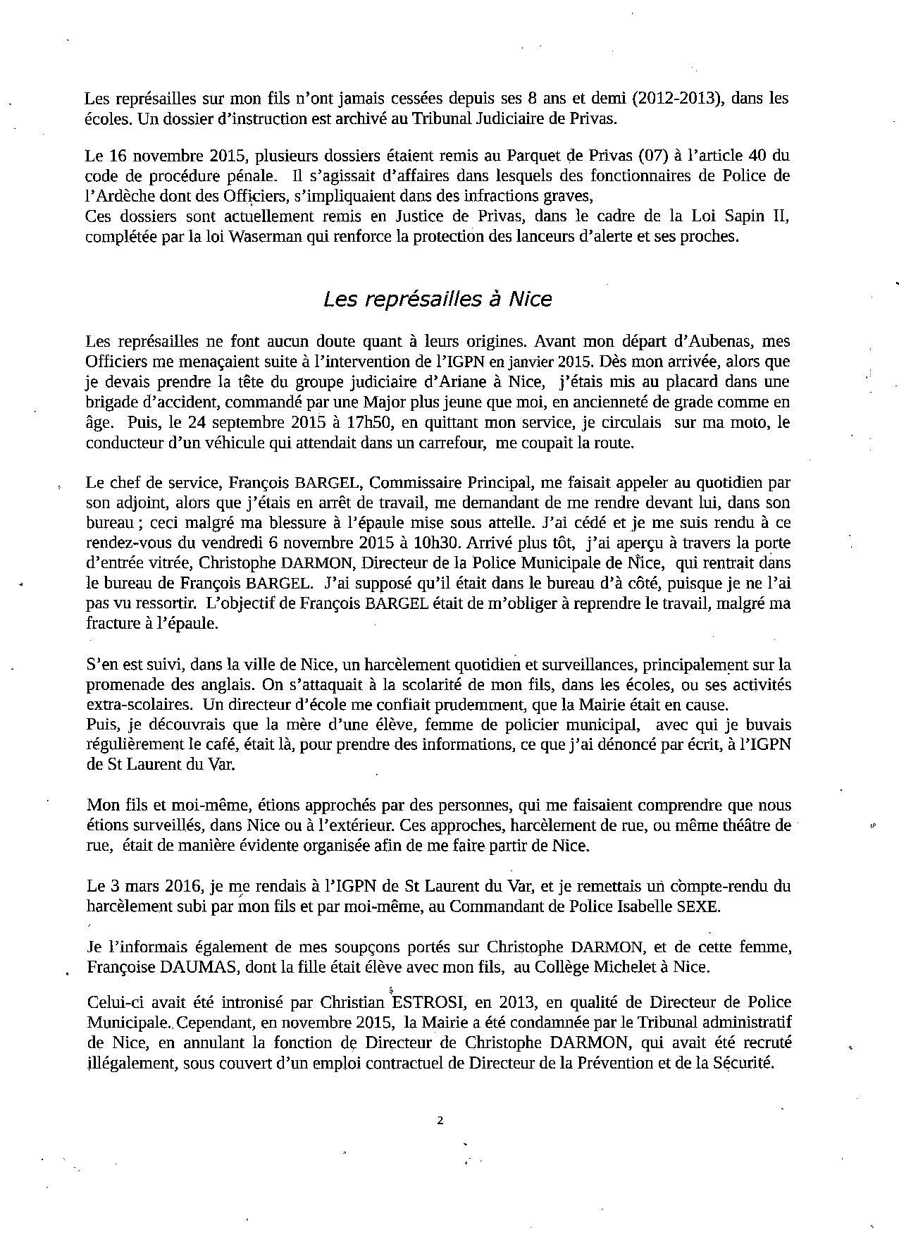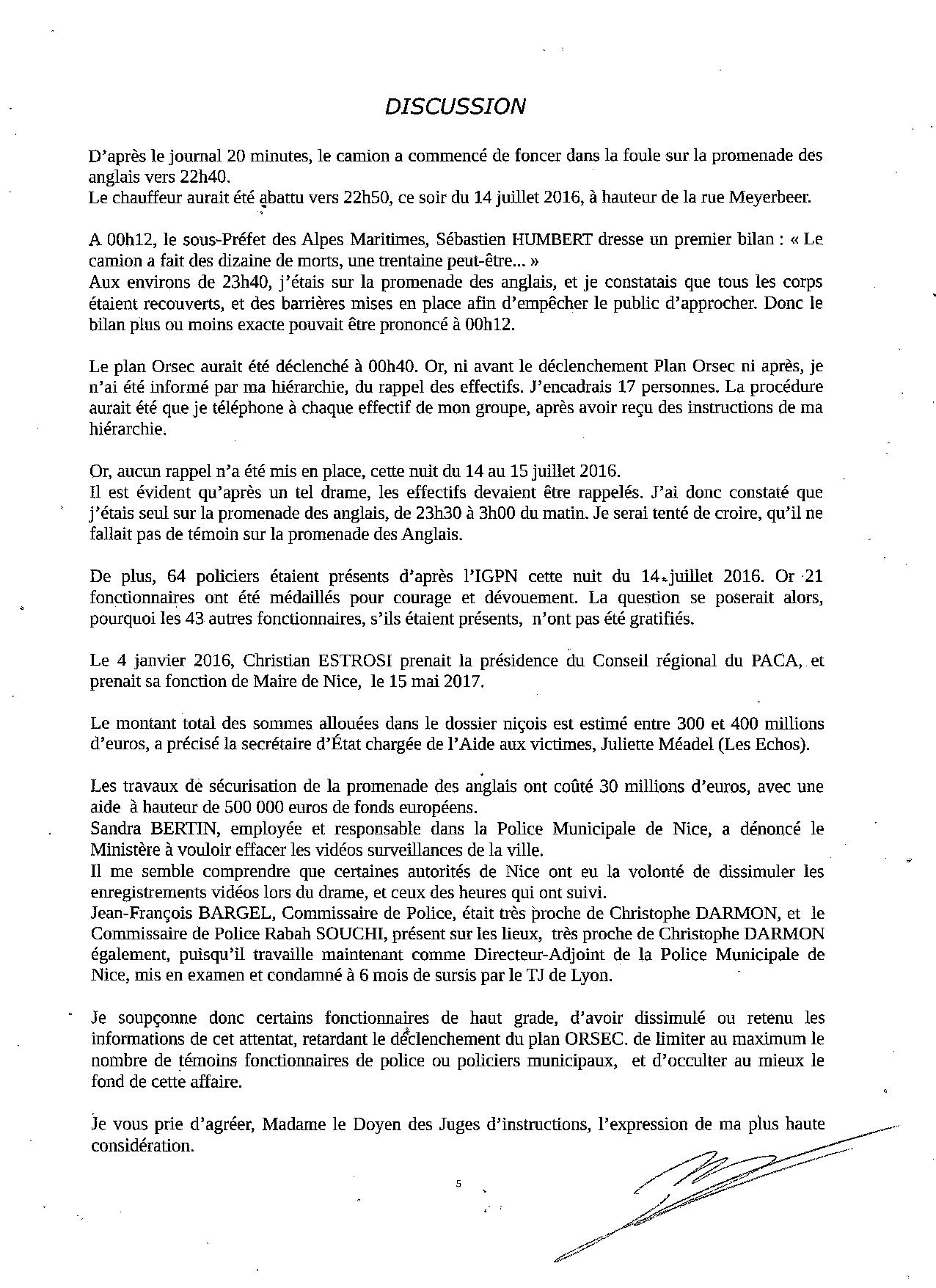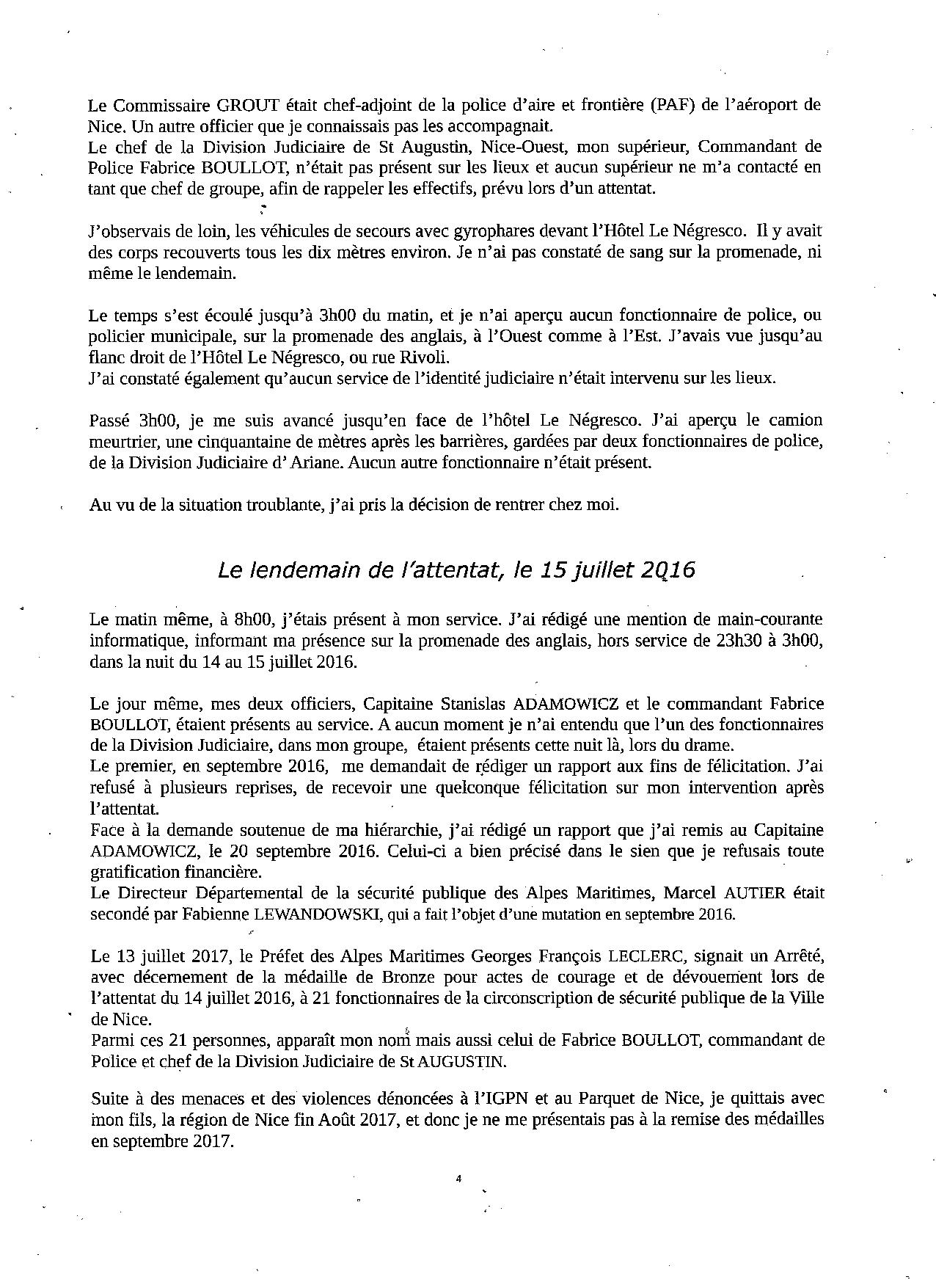 | Mon témoignage sur la sécurité mise en place à Nice, le 14 juillet 2016, ne se limite pas à l'attentat. J'y ai exposé, des faits de manipulation, de harcèlement, de surveillance, à mon encontre, afin de démontrer les comportements frauduleux des autorités policières, jusqu'au jour de l'attentat. |