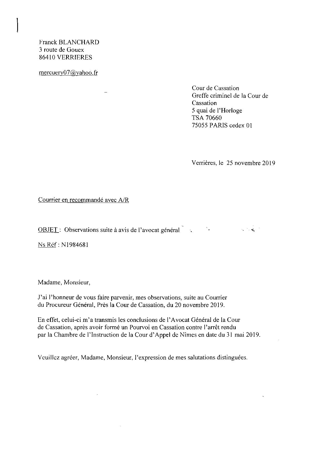 OBSERVATIONS AU GREFFE CRIMINEL SUITE AVIS AVOCAT GENERAL
