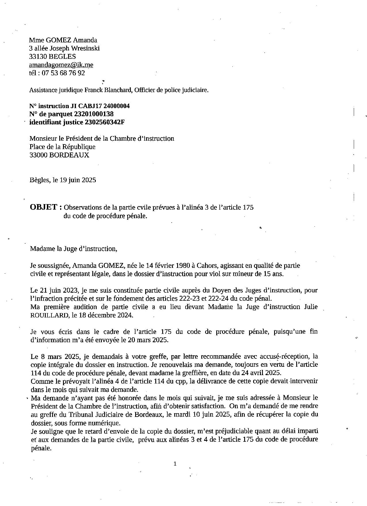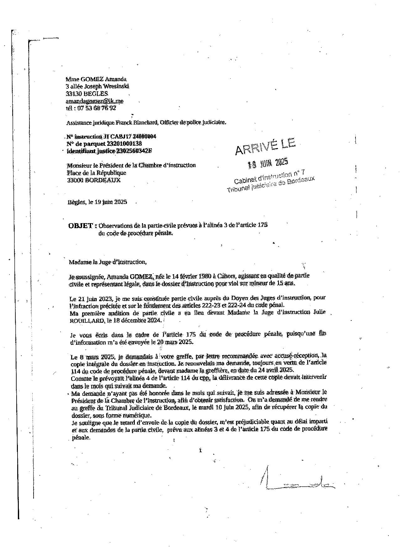 Suite à la plainte avec constitution de partie civile auprès du Doyen du Juge d'instruction d'Amanda GOMEZ, pour son fils placé depuis 2019, et violé en famille d'accueil, par un autre mineur. Abdel avait 7 ans. Lorsque le Juge d'instruction décide d'une fin d'information, la partie civile peut lui adresser dans le délai de trois mois, ses observations en vertu de l'article 175 alinéa 3 du code de procédure pénale. Alors que le Juge d'instruction ne répondait pas dans le délai d'un mois, afin d'obtenir copie de la procédure en vertu de l'article 114 du CPP, le président de la chambre de l'instruction nous répondait favorablement, et à temps. Trois pages d'observations qui déterminent le lieu et la date du viol du mineur. L'adjudant de la gendarmerie n'a pas fait son travail puisqu'il n'en fait pas état dans sa synthèse. Une affaire étouffée par les enquêteurs et le magistrat. |