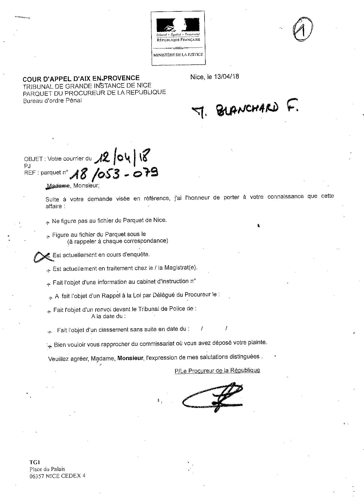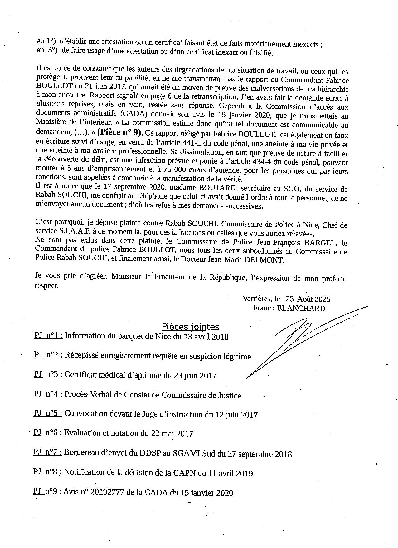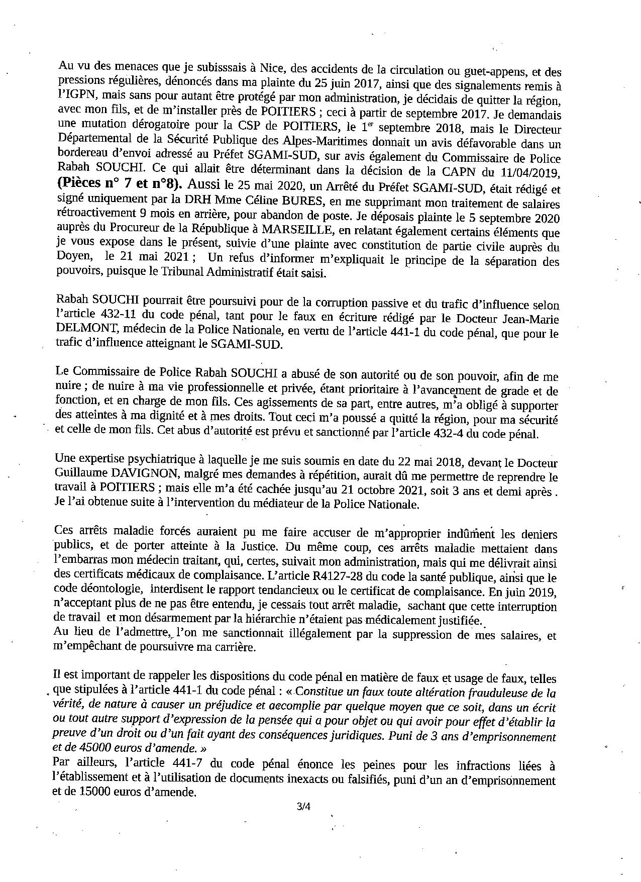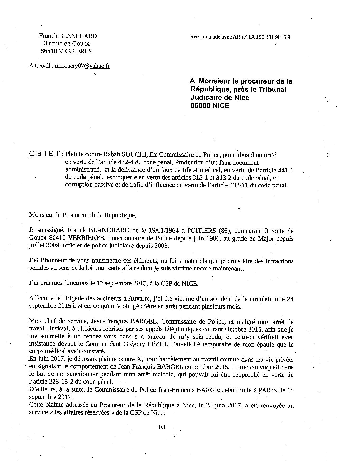 | xwxx | PLAINTE POUR ESCROQUERIE ABUS DE POUVOIR, CORRUPTION PASSIVE ET TRAFIC D'INFLUENCE, PRODUCTION D'UN FAUX DOCUMENT ADMINISTRATIF ET FAUX CERTIFICAT MEDICAL, contre Rabah SOUCHI, Commissaire de Police à NICE. |
