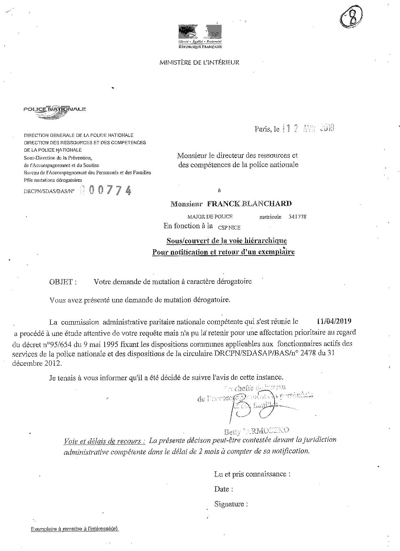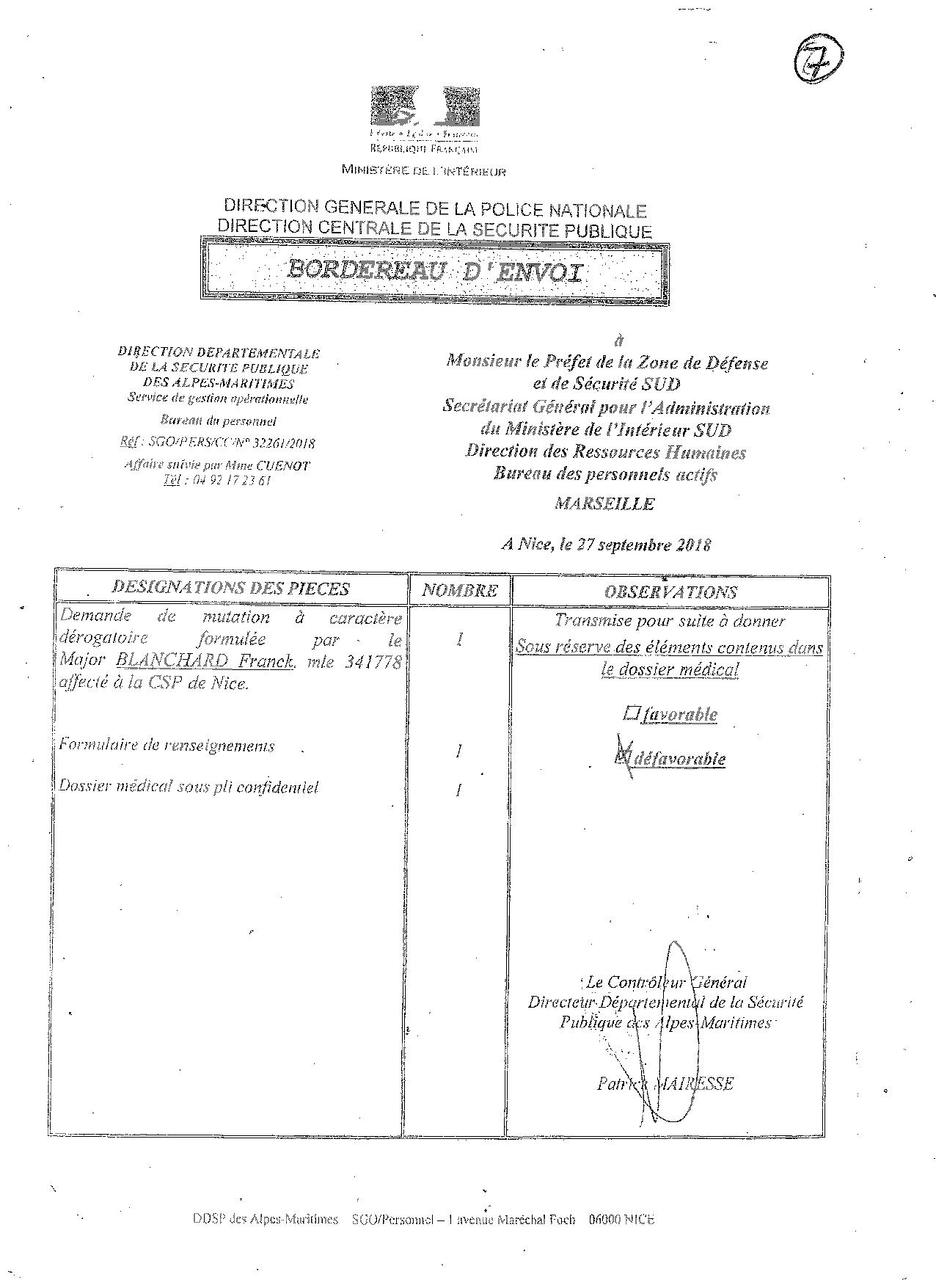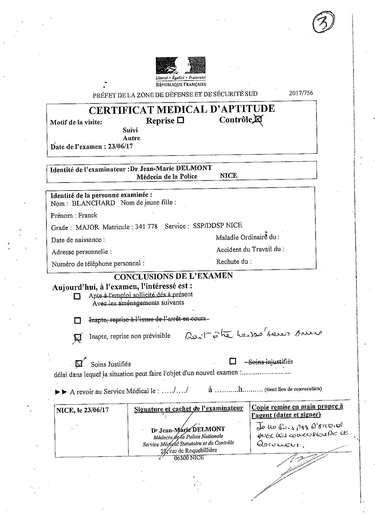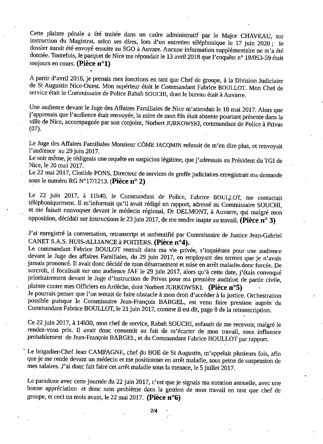 Suite à une demande de récusation du Juge des Affaires Familiales de NICE, ma hiérarchie sous influence du Commissaire Jean-François BARGEL, lui-même sous forte influence de la Sécurité de la Mairie (ex-officiers de police), me faisait désarmer en m'obligeant à me positionner en congé maladie. Ceci sous prétexte, de ma potentielle dangerosité lors d'une future audience familiale qui n'existait plus. Un enregistrement retranscrit atteste les manoeuvres de mes supérieurs afin de m'écarter de ma fonction. Une plainte envoyée au Procureur de Nice, le 25 juin 2017, avait été repris par un major de police des affaires réservées, qui la traitait dans un cadre administratif; ma plainte disparaissait donc. Jean-François BARGEL avait été muté peu de temps après, et Rabah SOUCHI impliqué dans l'affaire Geneviève LEGAY, a été condamné, et forcé de quitter la Police Nationale. Il travaille maintenant dans la sécurité de la Mairie de NICE. |