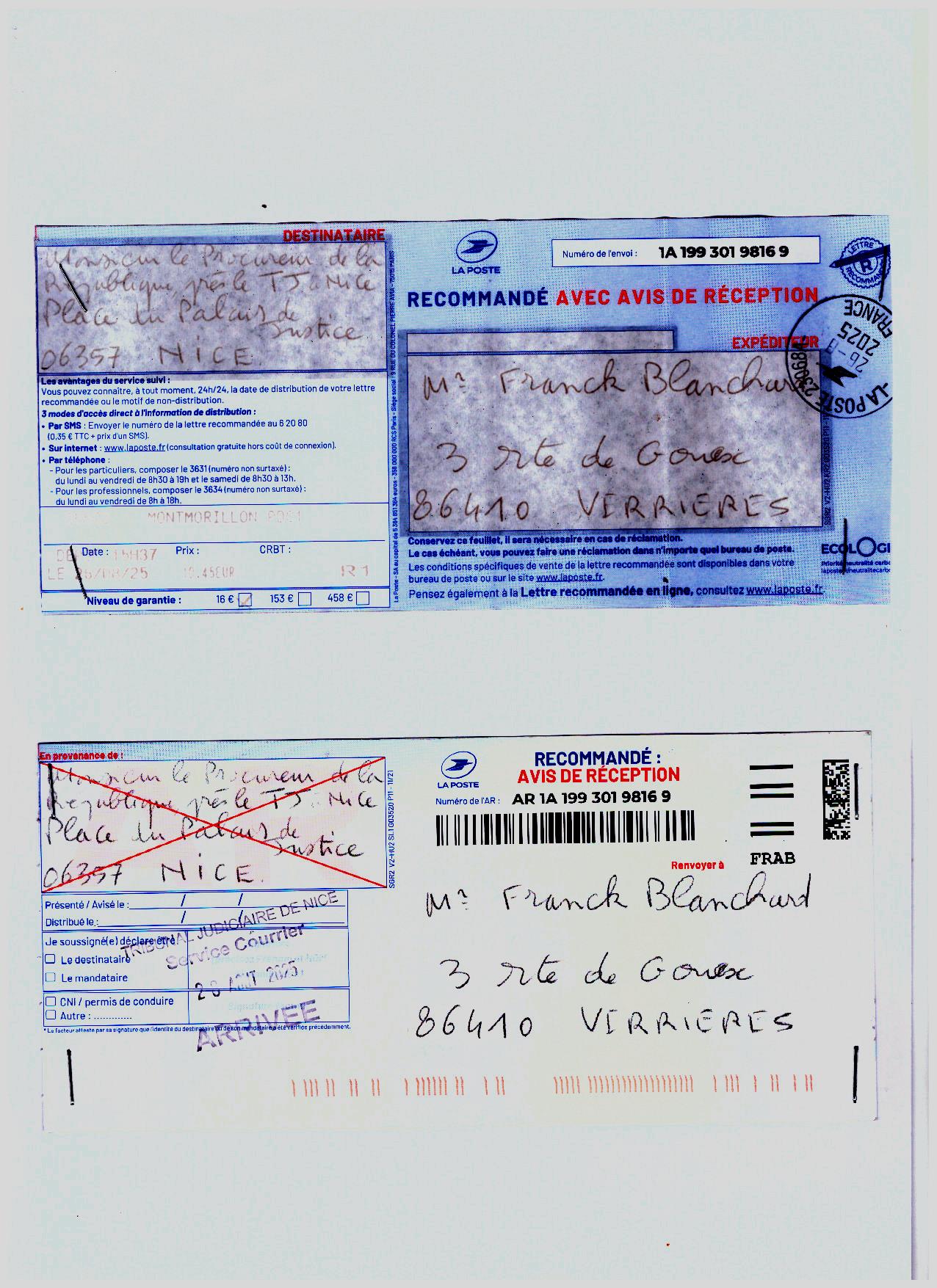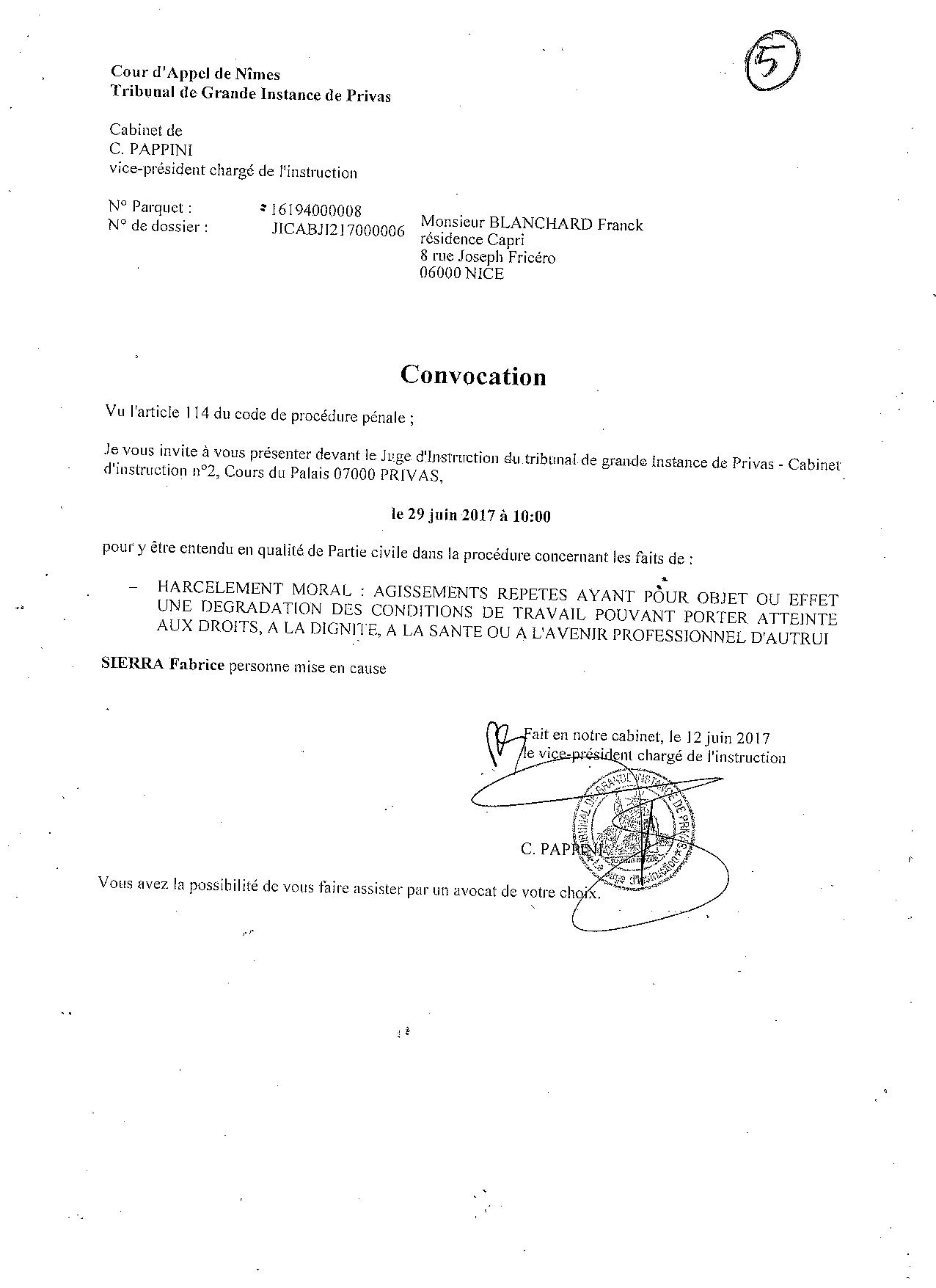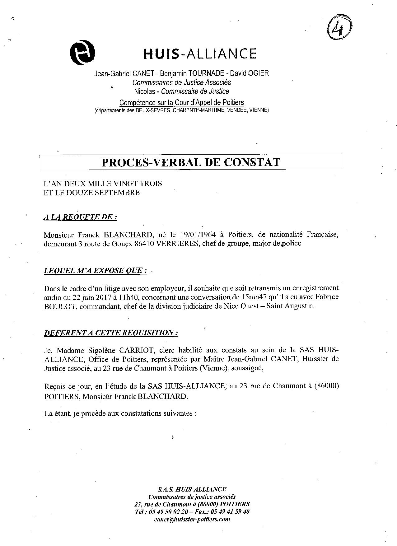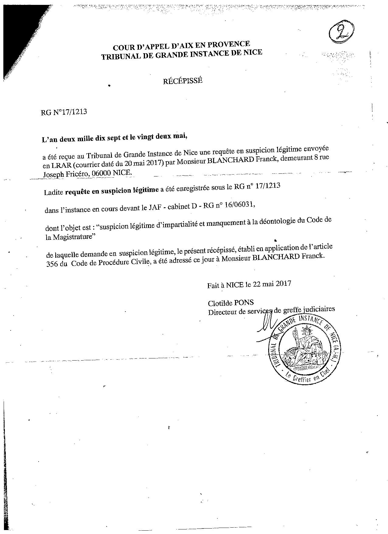Suite à une demande de récusation du Juge des Affaires Familiales de NICE, ma hiérarchie sous influence du Commissaire Jean-François BARGEL, lui-même sous forte influence de la Sécurité de la Mairie (ex-officiers de police), me faisait désarmer en m'obligeant à me positionner en congé maladie. Ceci sous prétexte, de ma potentielle dangerosité lors d'une future audience familiale qui n'existait plus. Un enregistrement retranscrit atteste les manoeuvres de mes supérieurs afin de m'écarter de ma fonction. Une plainte envoyée au Procureur de Nice, le 25 juin 2017, avait été repris par un major de police des affaires réservées, qui la traitait dans un cadre administratif; ma plainte disparaissait donc. Jean-François BARGEL avait été muté peu de temps après, et Rabah SOUCHI impliqué dans l'affaire Geneviève LEGAY, a été condamné, et forcé de quitter la Police Nationale. Il travaille maintenant dans la sécurité de la Mairie de NICE. |