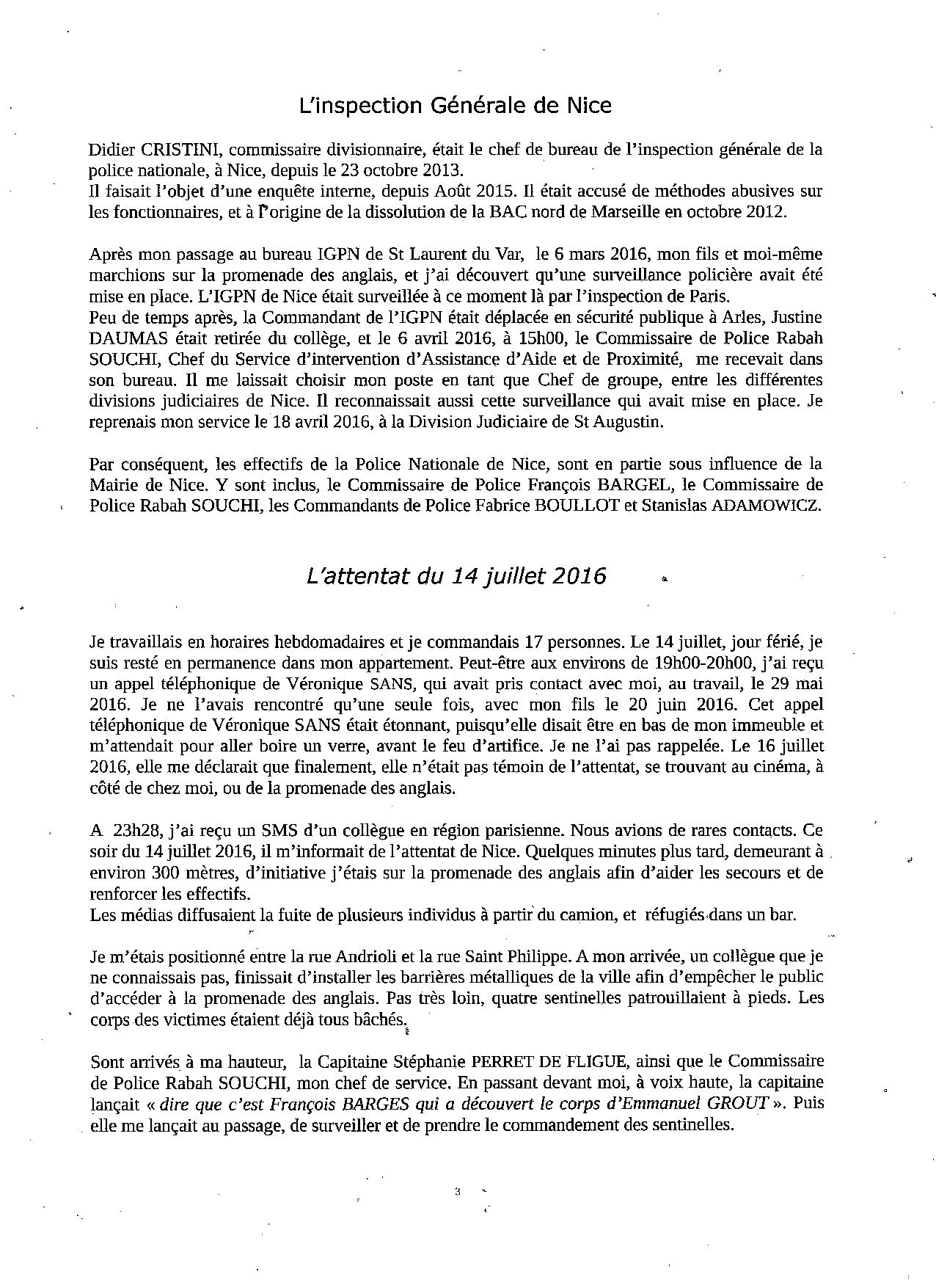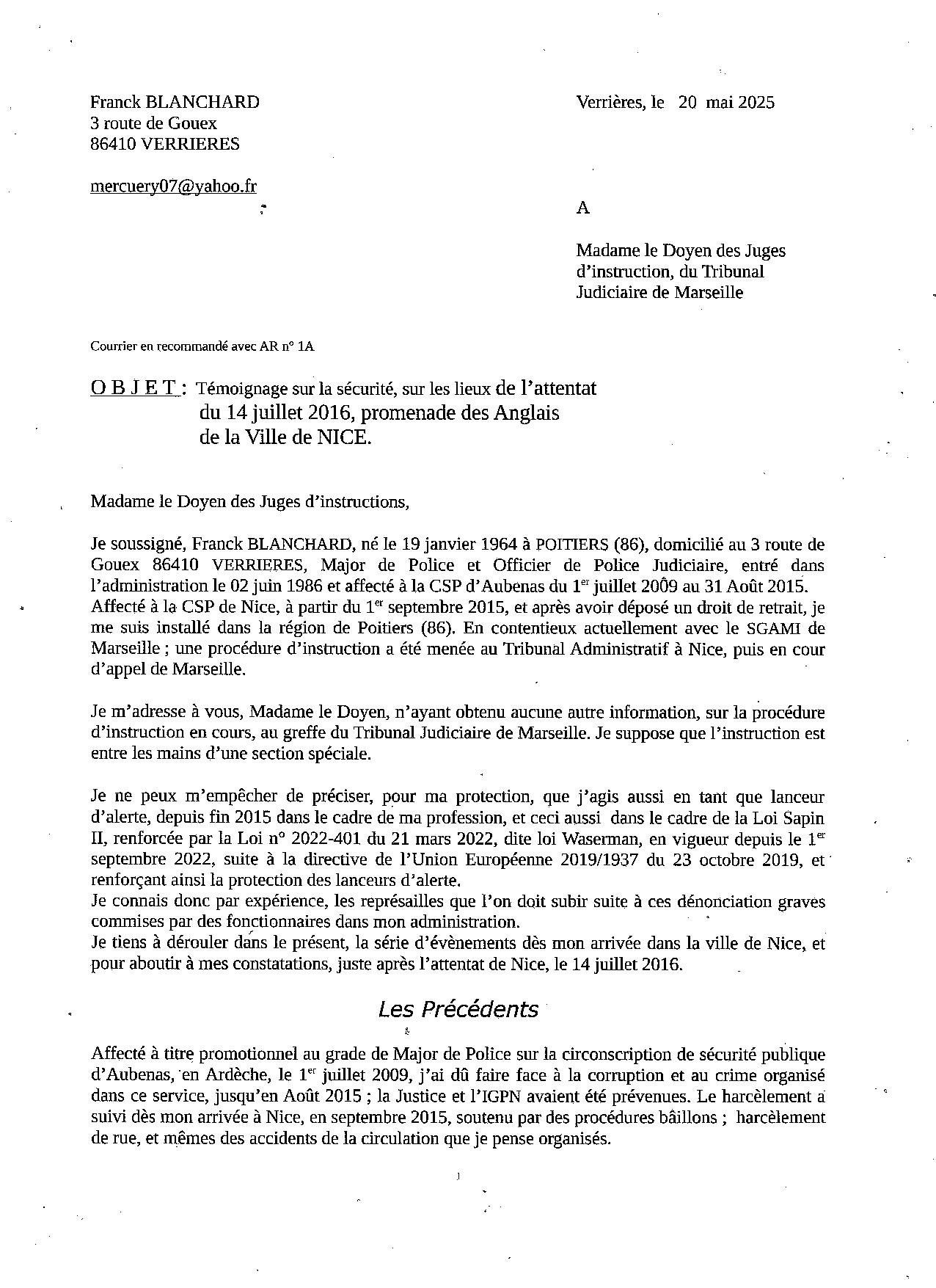 | Mon témoignage sur la sécurité mise en place à Nice, le 14 juillet 2016, ne se limite pas à l'attentat. J'y ai exposé, des faits de manipulation, de harcèlement, de surveillance, à mon encontre, afin de démontrer les comportements frauduleux des autorités policières, jusqu'au jour de l'attentat. |