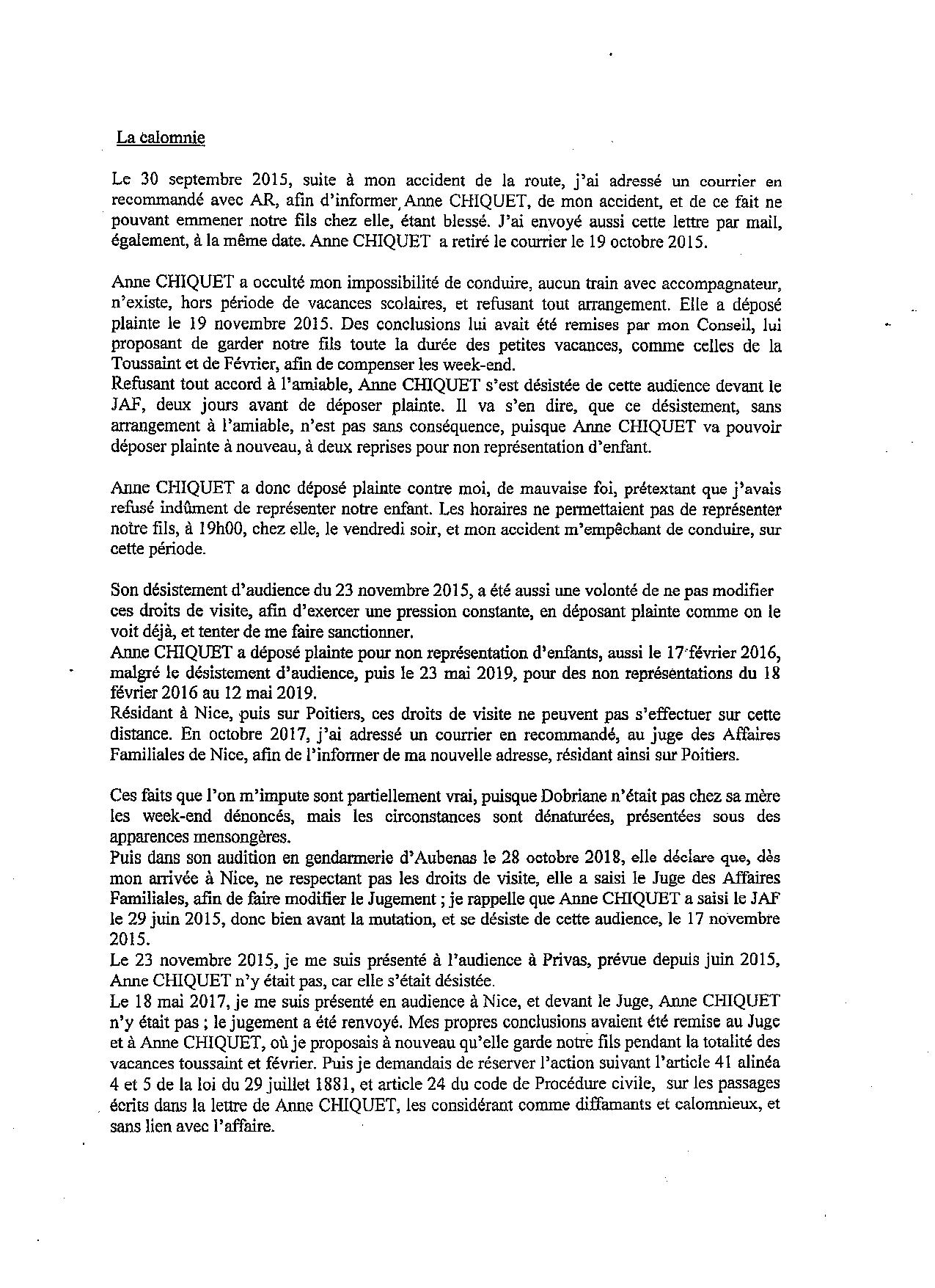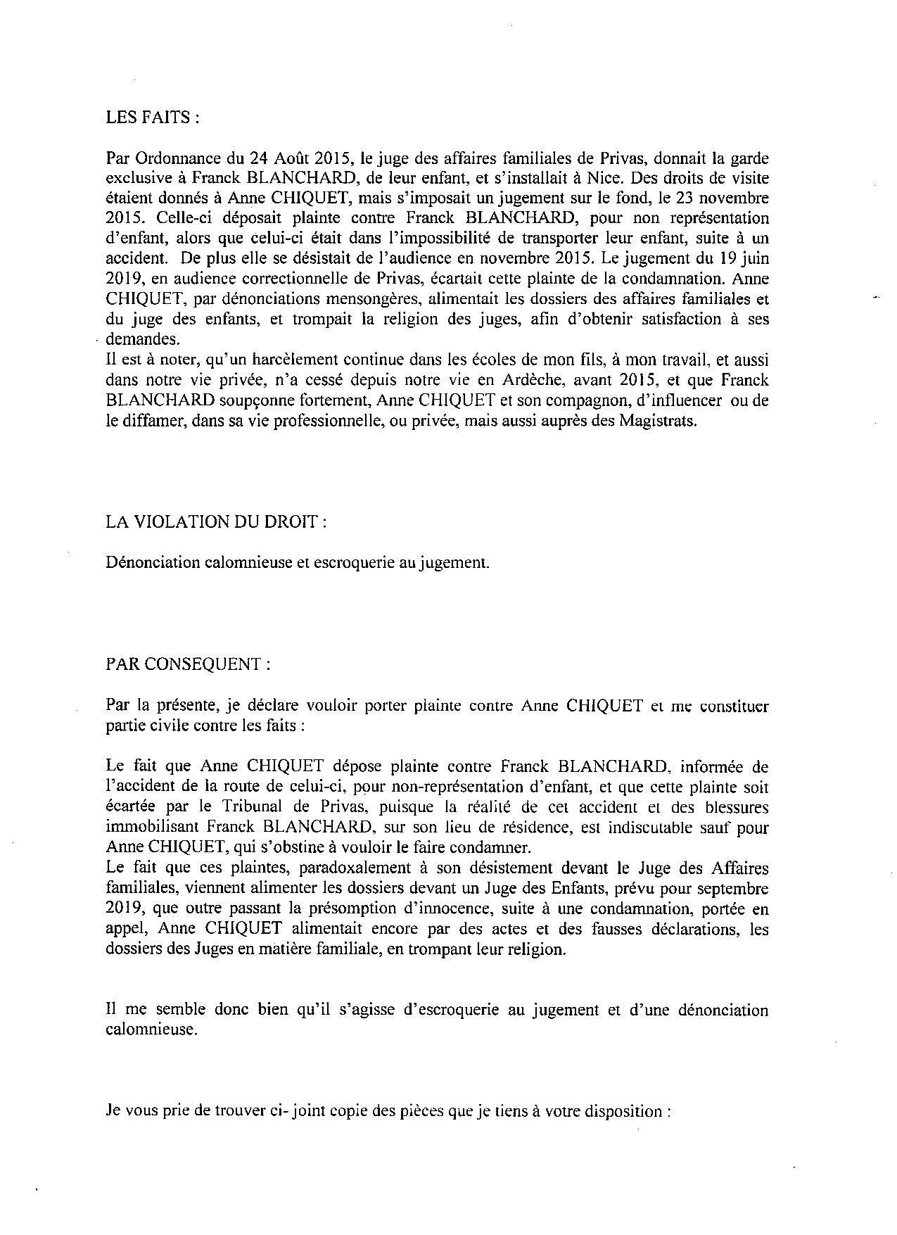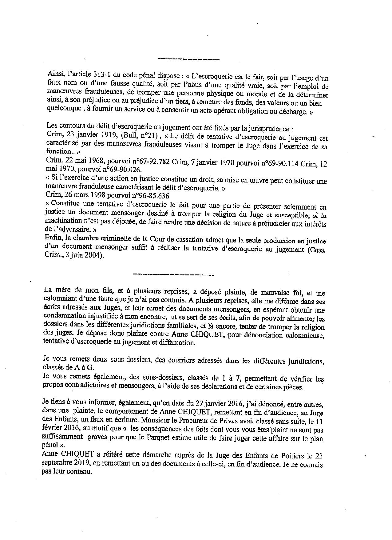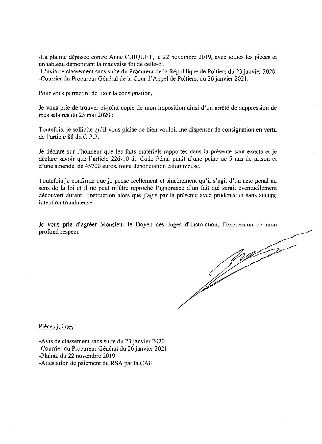 | PLAINTE AVEC CONSTITUTION DE PARTIE CIVILE AUPRES DU DOYEN DES JUGES D'INSTRUCTION contre Anne CHIQUET pour DENONCIATION CALOMNIEUSE, ESCROQUERIE AU JUGEMENT et DIFFAMATION |
