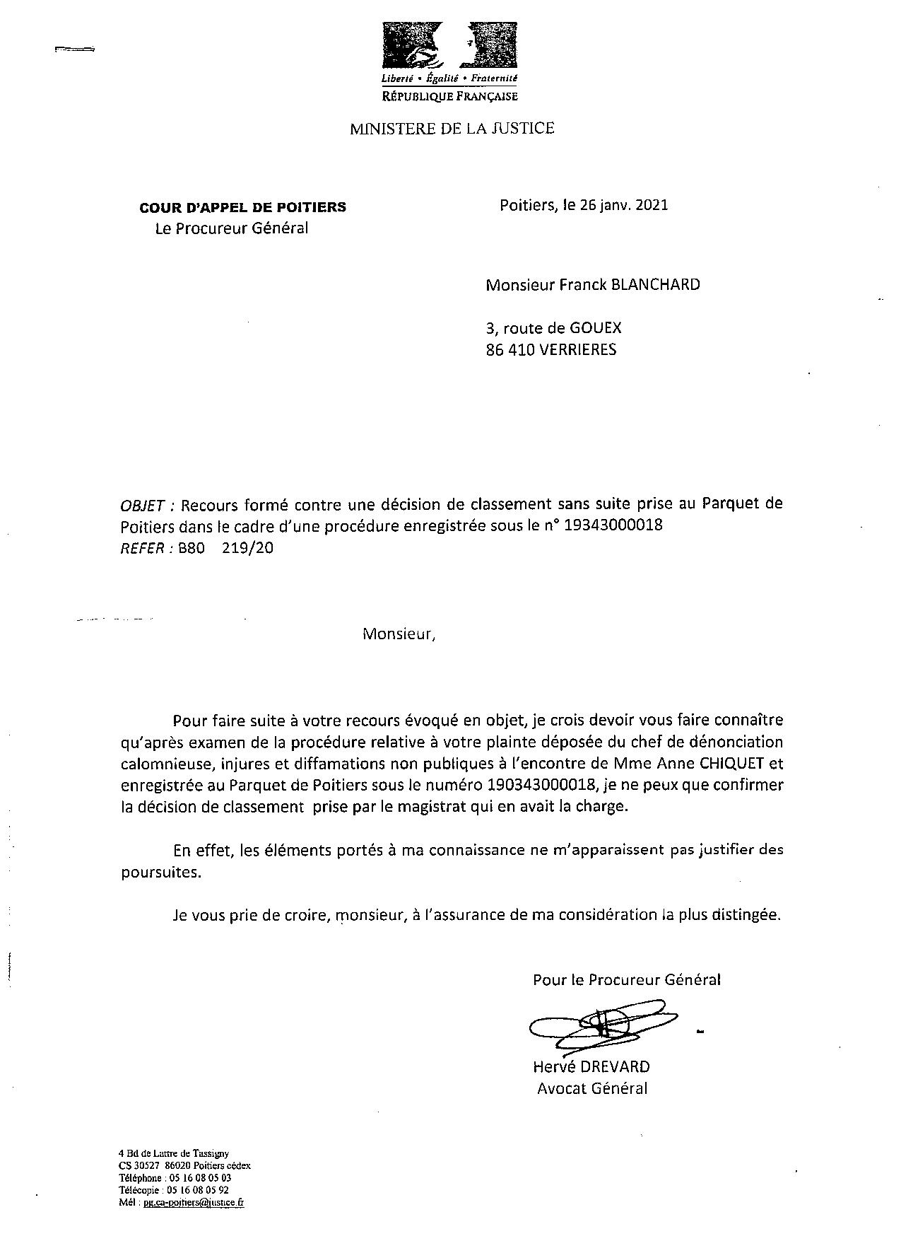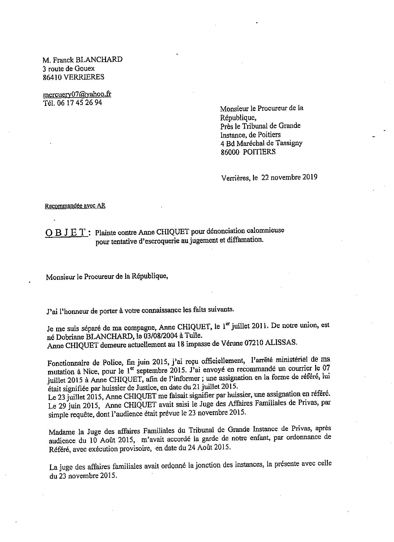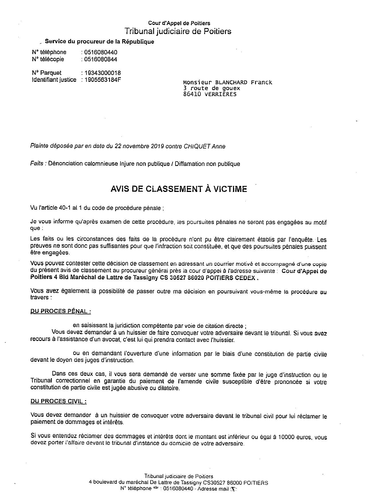 Au vu de la corruption constatée en Ardèche, ainsi qu'au Tribunal Judiciaire de PRIVAS, influencé par les Officiers de police entourant Anne CHIQUET, il était inutile d'adresser cette plainte auprès du Doyen de Privas. Christelle LACOUR, Juge d'instruction et Doyen à POITIERS, ne pouvait qu'être au courant et collaborer donc à cette corruption; cela pouvait se vérifier dans deux autres dossiers, en 2024. |