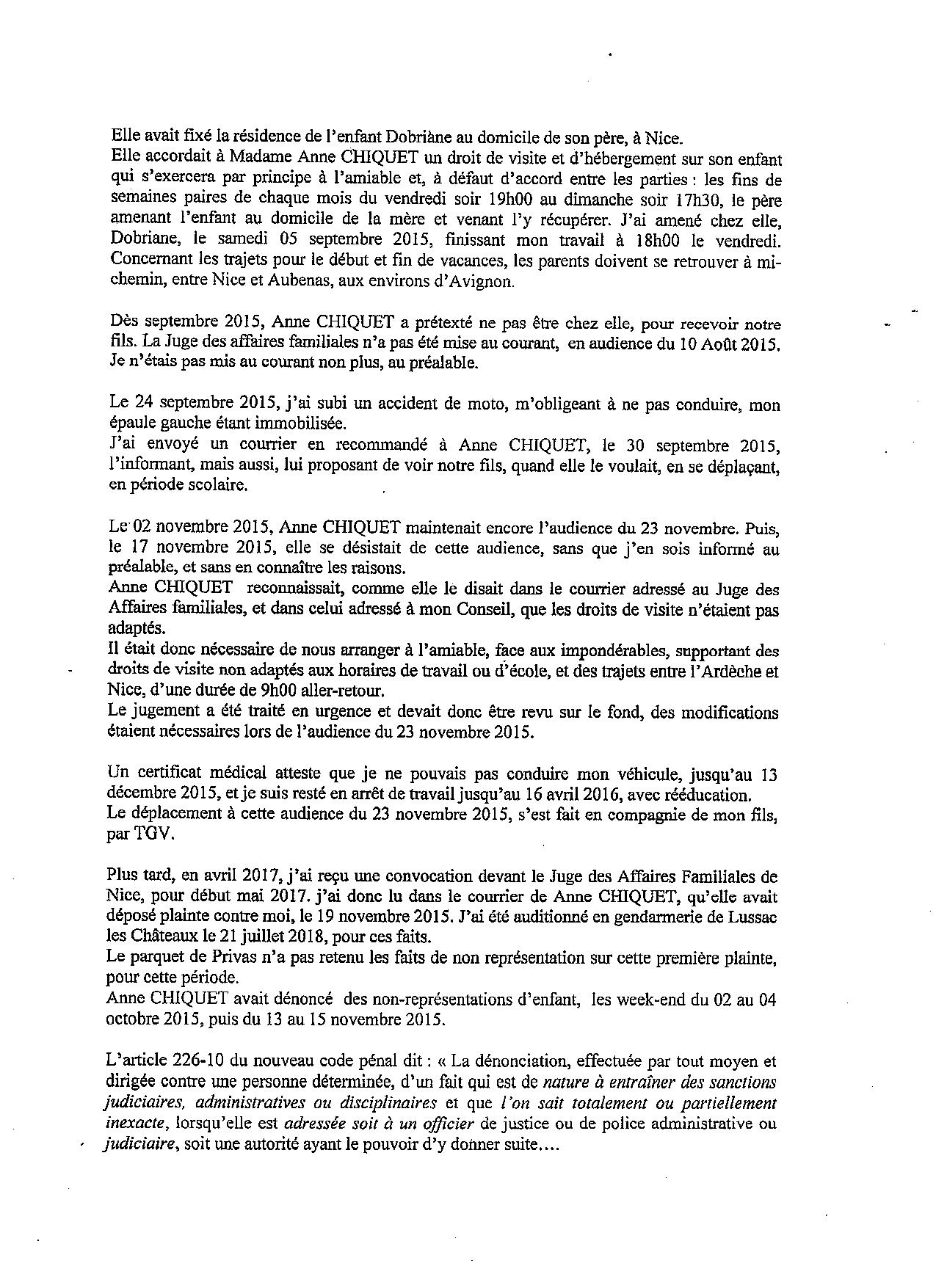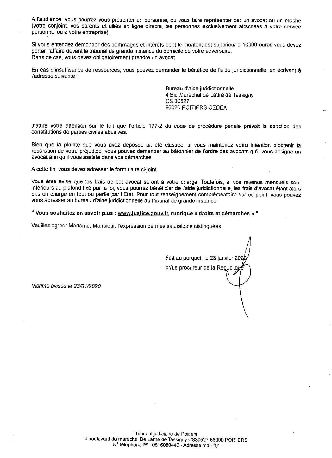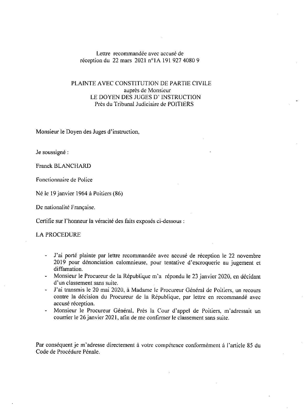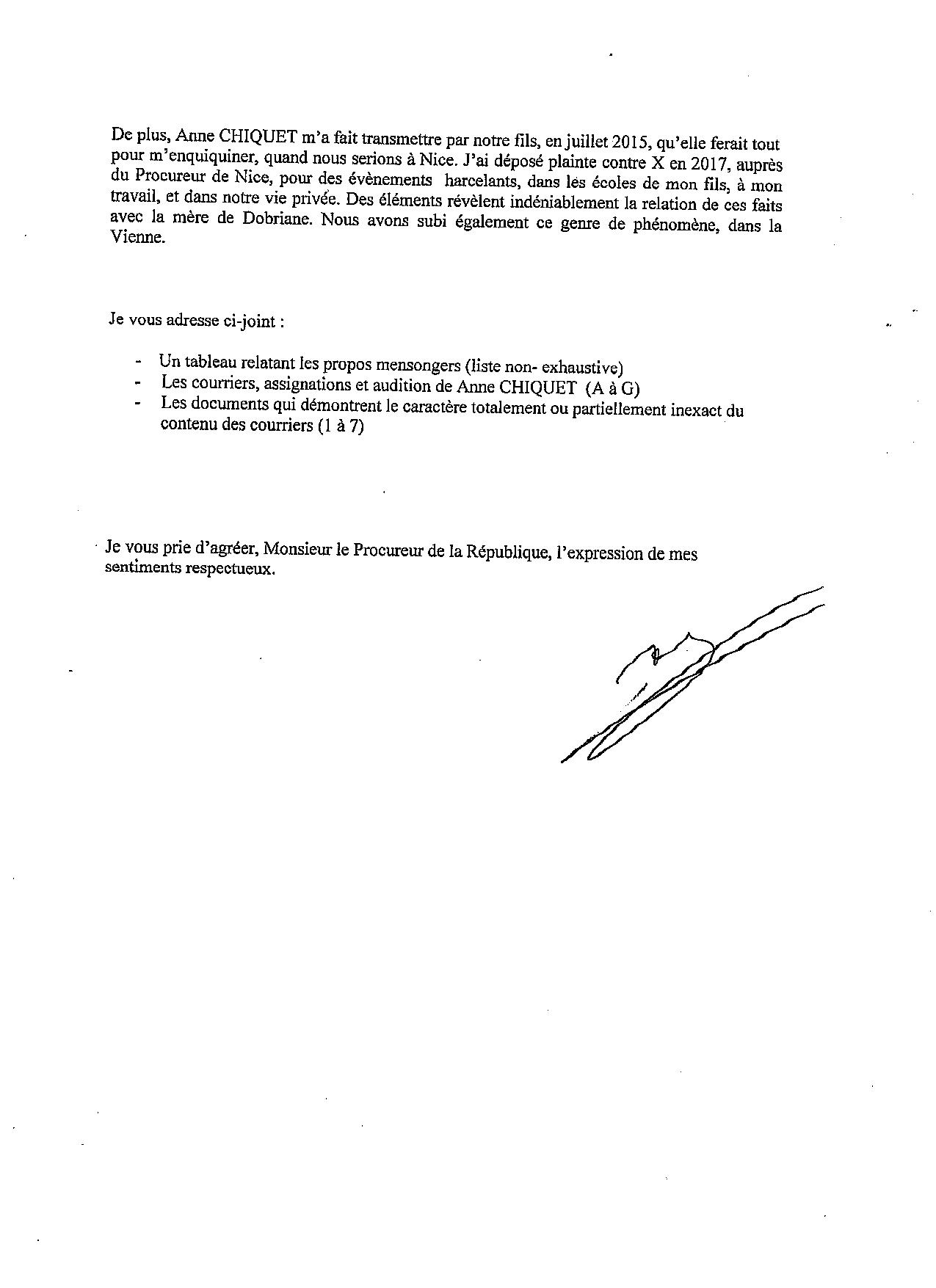 Au vu de la corruption constatée en Ardèche, ainsi qu'au Tribunal Judiciaire de PRIVAS, influencé par les Officiers de police entourant Anne CHIQUET, il était inutile d'adresser cette plainte auprès du Doyen de Privas. Christelle LACOUR, Juge d'instruction et Doyen à POITIERS, ne pouvait qu'être au courant et collaborer donc à cette corruption; cela pouvait se vérifier dans deux autres dossiers, en 2024. |