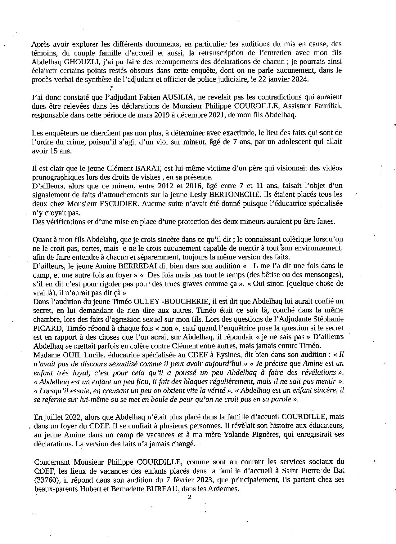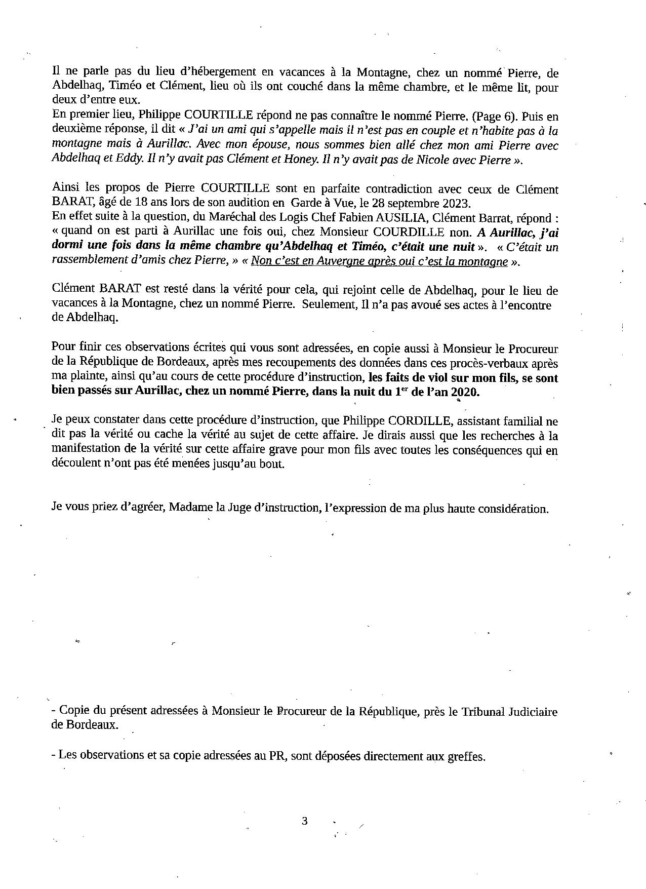Suite à la plainte avec constitution de partie civile auprès du Doyen du Juge d'instruction d'Amanda GOMEZ, pour son fils placé depuis 2019, et violé en famille d'accueil, par un autre mineur. Abdel avait 7 ans. Lorsque le Juge d'instruction décide d'une fin d'information, la partie civile peut lui adresser dans le délai de trois mois, ses observations en vertu de l'article 175 alinéa 3 du code de procédure pénale. Alors que le Juge d'instruction ne répondait pas dans le délai d'un mois, afin d'obtenir copie de la procédure en vertu de l'article 114 du CPP, le président de la chambre de l'instruction nous répondait favorablement, et à temps. Trois pages d'observations qui déterminent le lieu et la date du viol du mineur. L'adjudant de la gendarmerie n'a pas fait son travail puisqu'il n'en fait pas état dans sa synthèse. Une affaire étouffée par les enquêteurs et le magistrat. |