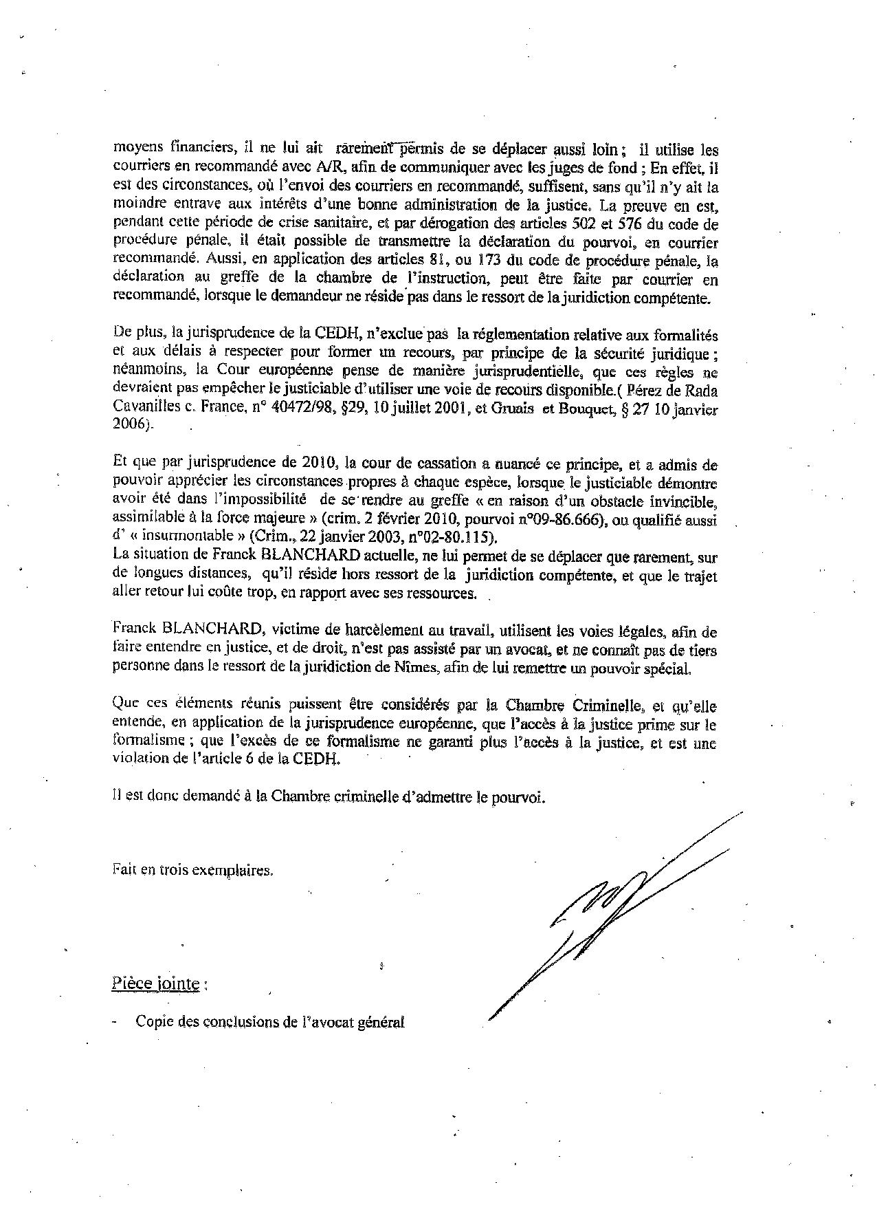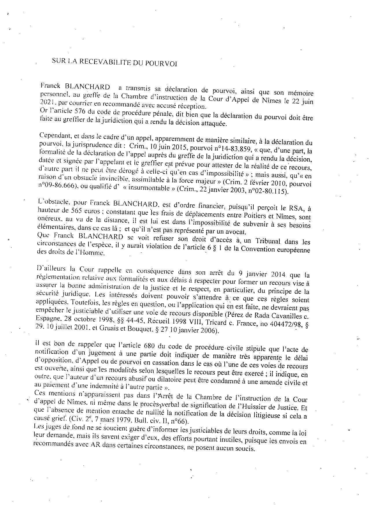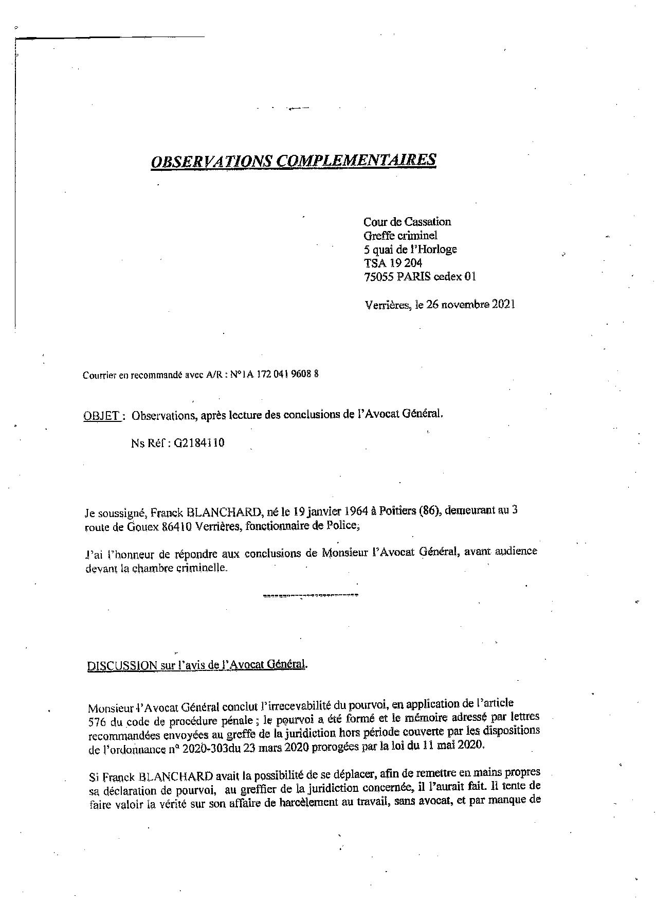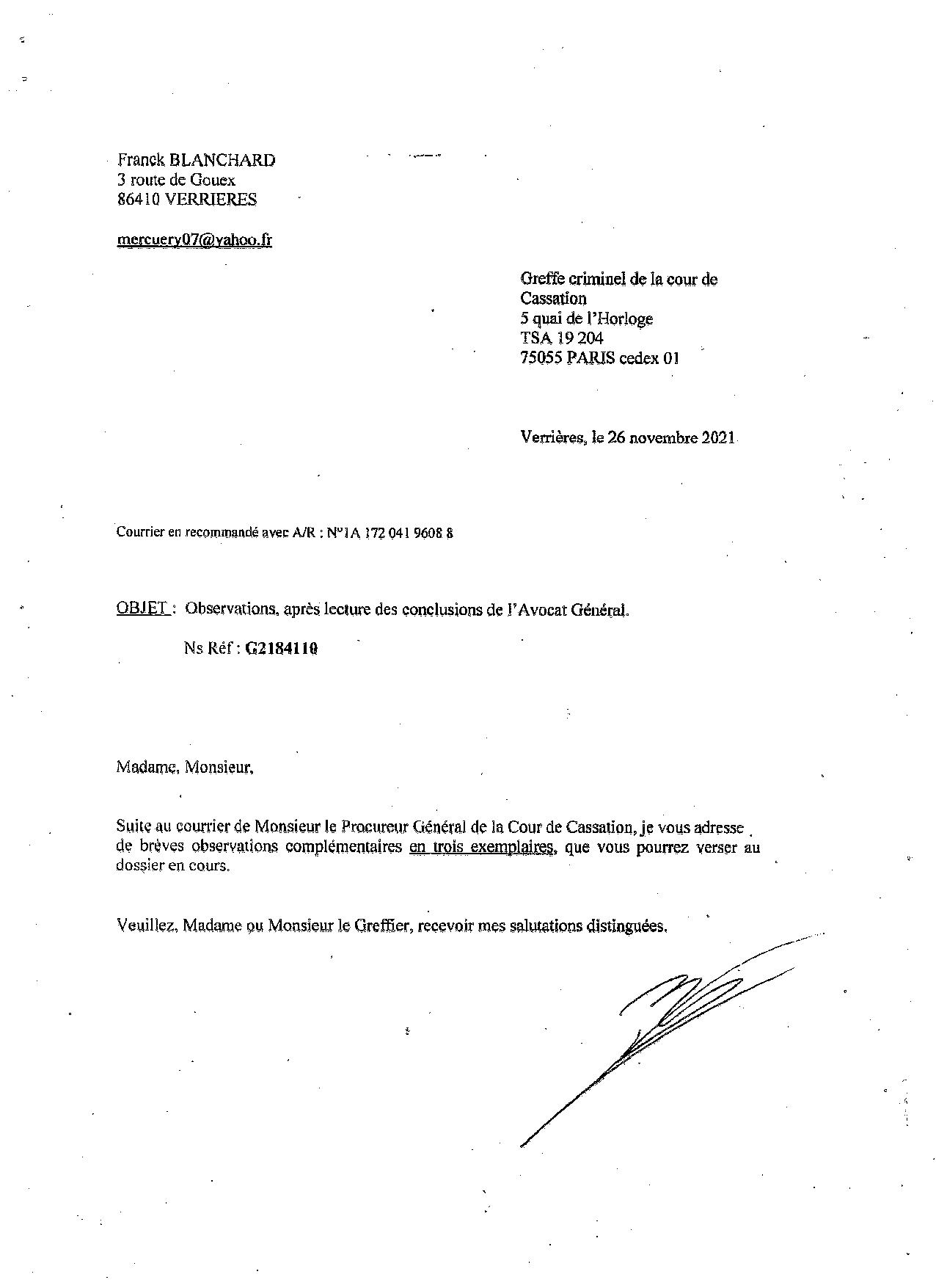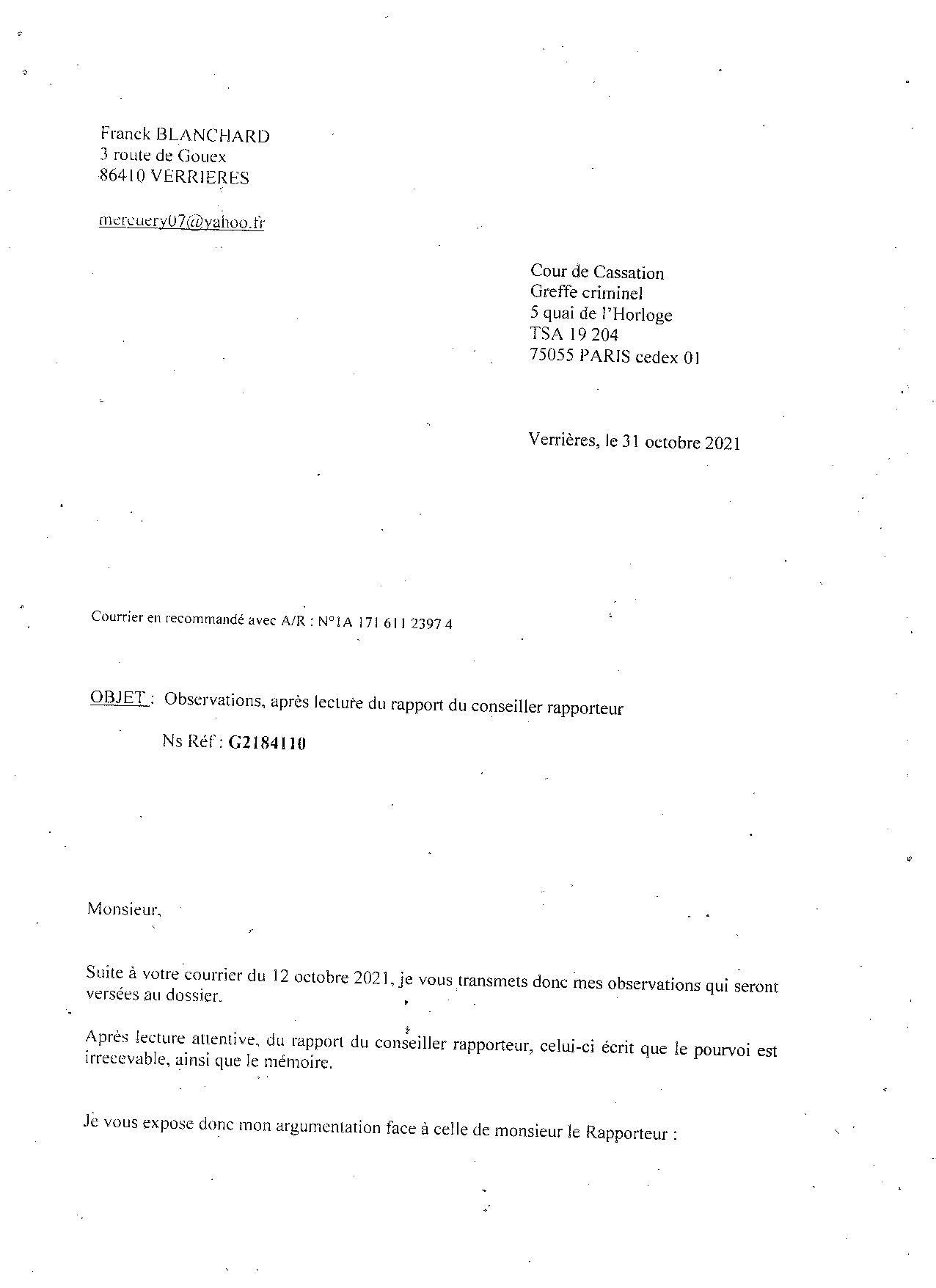 Observations adressées au Greffe Criminel de la Cour de Cassation
