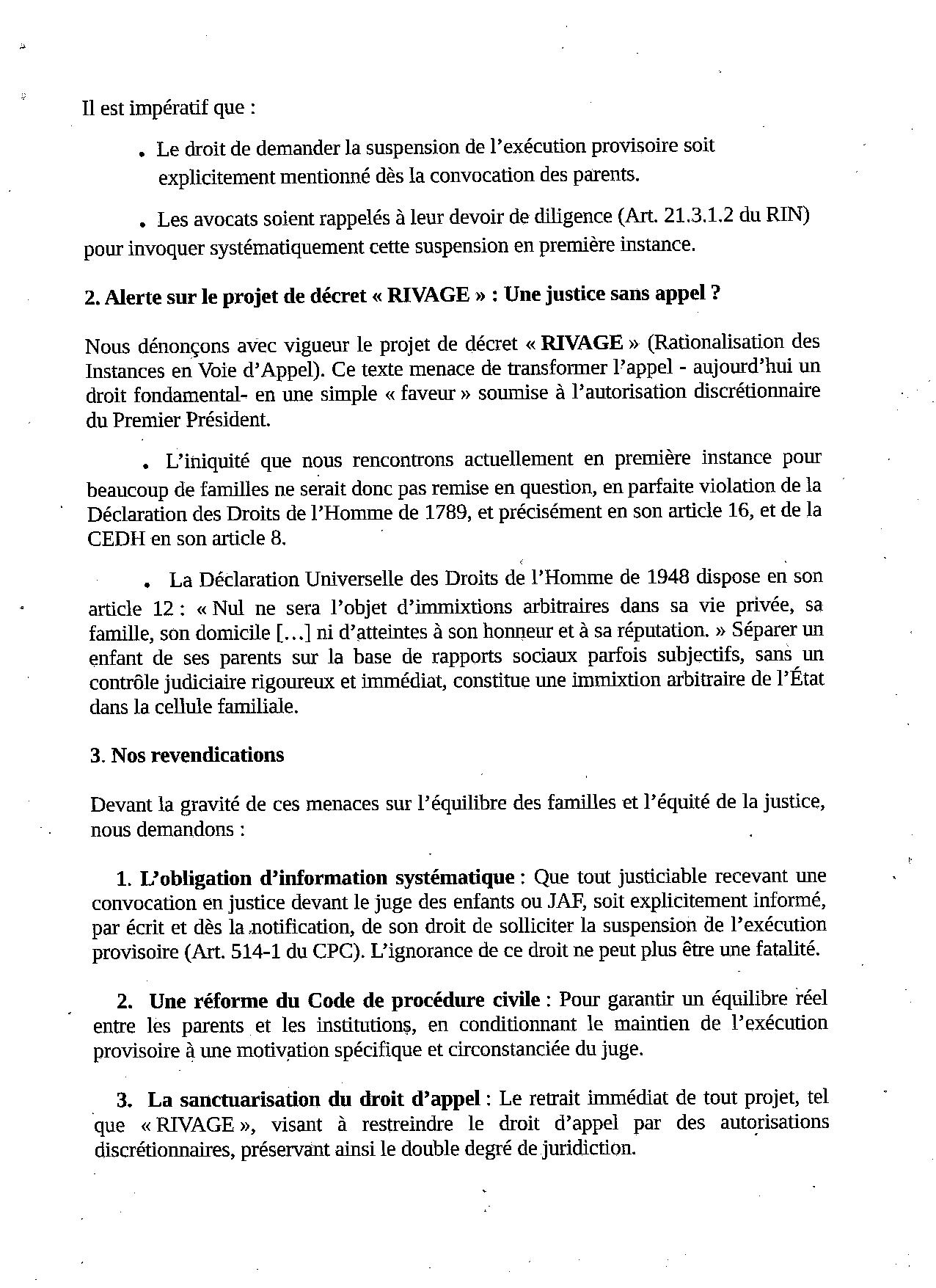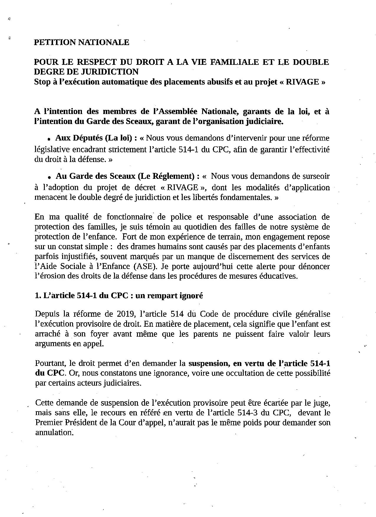 | xxxxx | Depuis 38 ans au sein de la Police Nationale, j'ai dénoncé la corruption et les réseaux occultes qui brisent nos familles. Aujourd'hui, le combat franchit une étape décisive. Nous lançons une Pétition Officielle auprès de l'assemblée Nationale. Pourquoi maintenant ? Parce que le projet de décret "RIVAGE" menace de supprimer le droit à l'appel, rendant les placements abusifs irrévocables. C'est la fin du double degré de juridiction, une violation flagrante de la CEDH. En tant que Major de Police et Président de l'association Adoption Forcée, je refuse ce "kidnapping institutionnel". Nous exigeons l'application stricte de l'article 514-1 du CPC pour suspendre les placements injustifiés. |